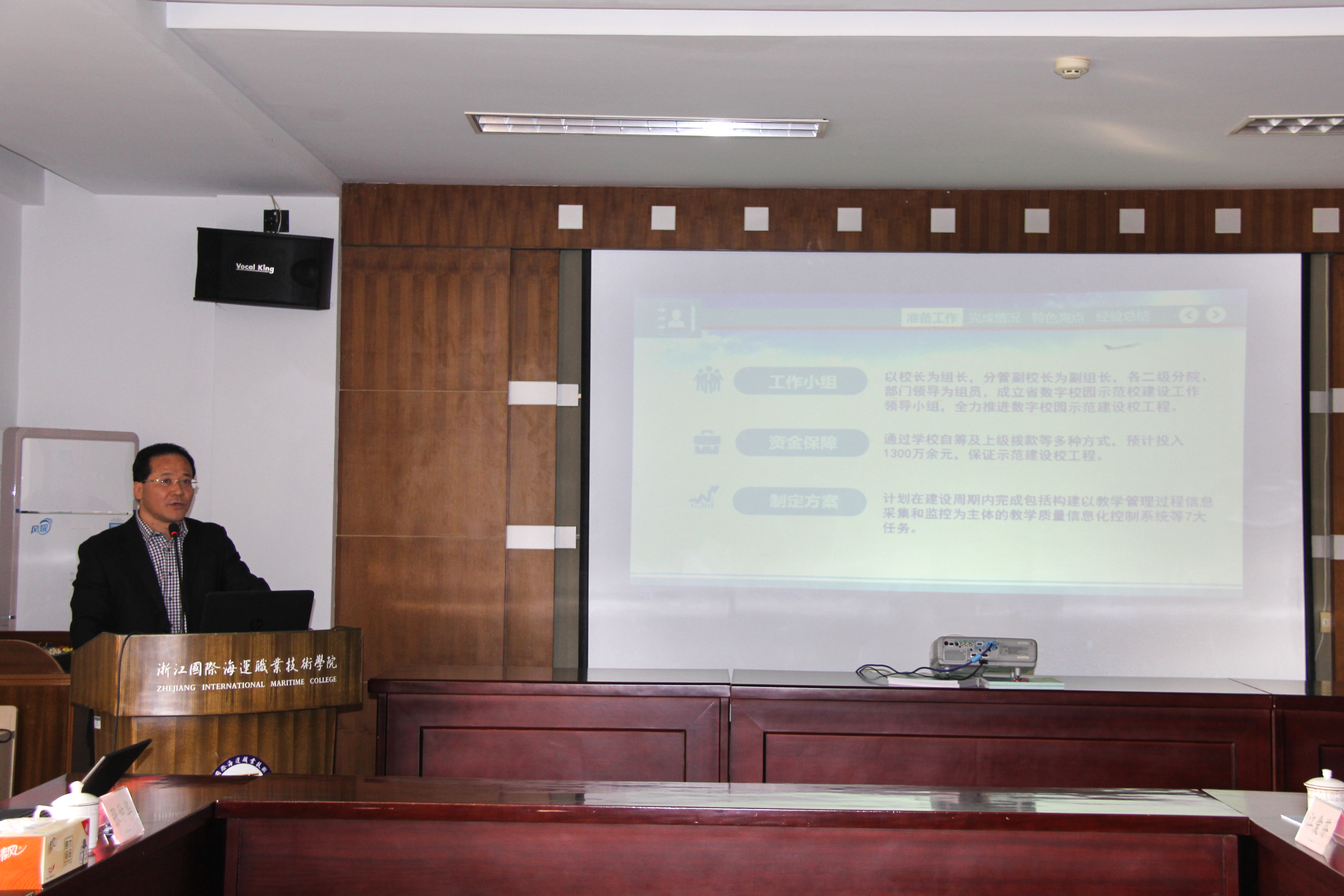 上午的验收汇报会由验收专家组组长浙江大学信息技术中心副主任程艳旗主持。王捷校长致欢迎辞,并介绍了学校概况和办学特色。孔志光副校长汇报了学校数字校园示范校建设的总体情况、建设成效和特色亮点等。自我校申报成功第二批省数字校园示范建设校以来,以打造基于过程数据采集和实时教学质量控制的数字校园示范校为主题,以促进信息技术与教育教学深入融合为核心,如期完成了基础网络设施设备完善、打造有效的教学质量监控、建成新门户网站和统一身份认证系统等七大块十多项建设任务。“虚拟仿真技术在航海人才培养上的应用”、“强化过程控制,保障质量管理有效运行——信息化在质量管理中的应用”、“基于船员教育和培训质量管理体系的船员培训管理系统的开发和应用”三个创新案例集中体现了学校信息化建设的亮点和特色。会上还播放了学校精心制作的数字校园建设微视频,并由相关老师就我校数字校园建设的特色亮点进行了系统演示。专家组就教学质量监控各应用系统间的协同融合等问题与学校进行了互动沟通。