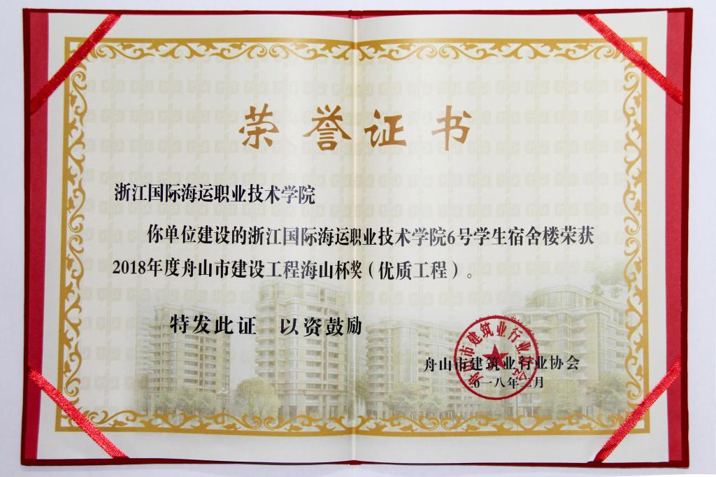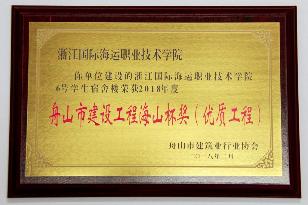 近日,舟山市住房和城乡建设局公布2018年舟山市建设工程海山杯奖(优质工程)评选结果,我校新建的6号学生宿舍楼项目名列其中,被评为“海山杯”优质工程奖。