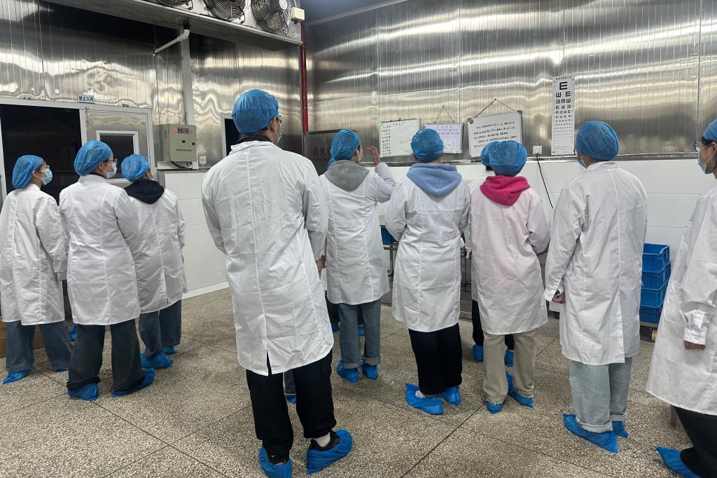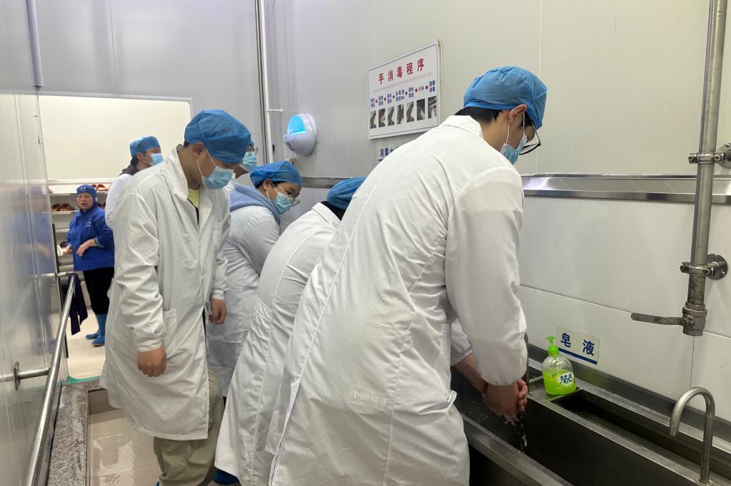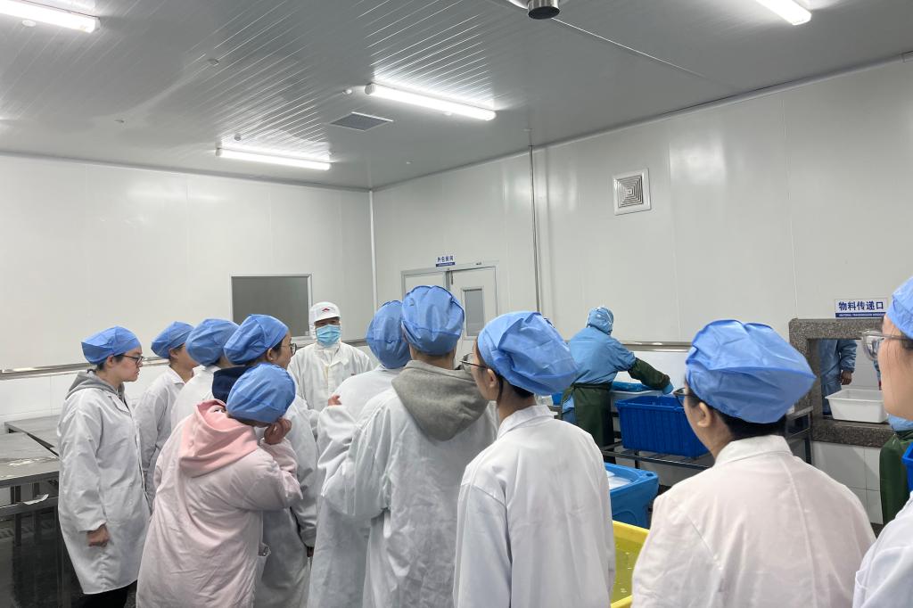 在海力生集团震洋食品公司质管部郑部长和璟源食品公司朱主任等6名企业技术人员的精心组织安排下,同学们进行了水产干制品加工与水产冷冻品加工的现场教学,内容包括:进入车间的卫生要求、原料处理、烘干、整形、包装、冷冻、质检等。通过现场实践教学,结合《海洋食品加工技术》等课程知识,同学们加深了对水产品原料处理、预处理工艺、速冻控温参数、干燥过程品控等关键技术及HACCP体系的CCP点和“理论参数转化为生产标准”的理解。