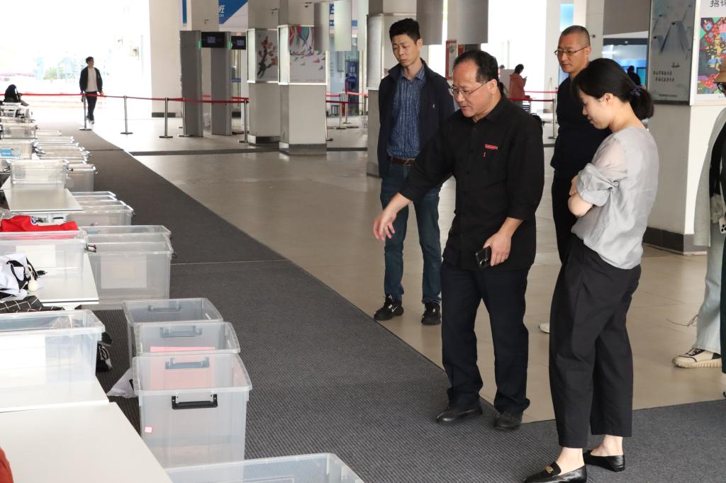 安检组的志愿者们仔细检查考生携带的物品,防止违禁品进入考场。