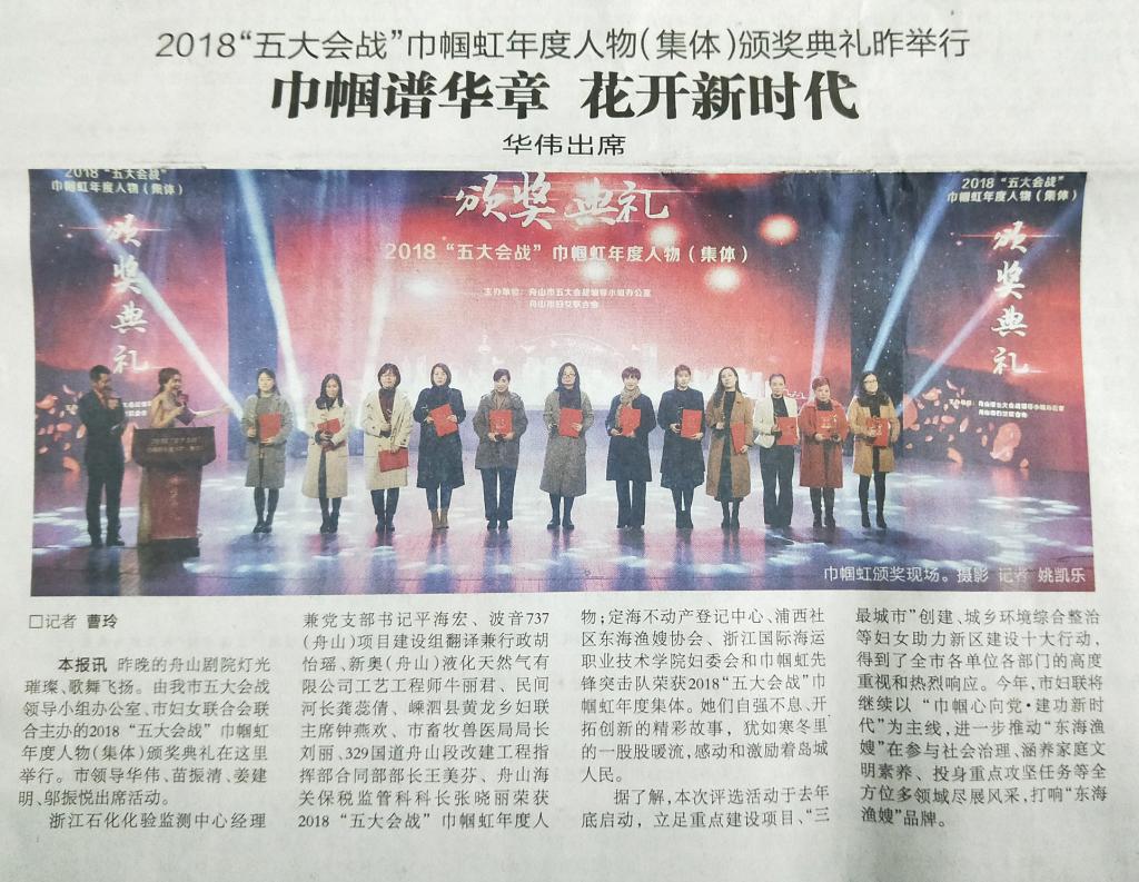 《舟山日报/舟山网/舟山文明网》:2018“五大会战”巾帼红年度人物(集体)颁奖典礼昨举行 巾帼谱华章 花开新时代