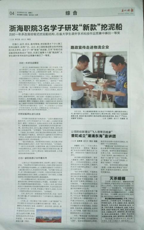 《舟山晚报》:浙海职院3名学子研发“新款”挖泥船