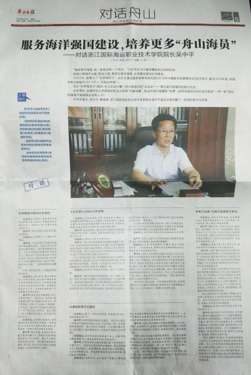吴中平:建校以来,学校立足舟山,服务浙江,面向海外,以“创一流航海院校、育优秀海运人才”为己任,积极打造舟山国际海员经济品牌,为浙江省海洋经济发展和国内外航运界输送了大批职业综合素质好、技能水平高的优秀人才。
