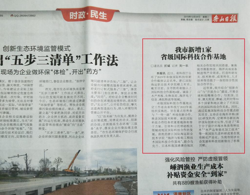 《舟山日报》:我市新增1家省级国际科技合作基地