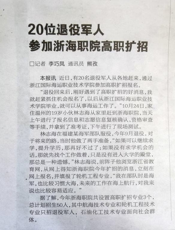 据了解,今年浙海职院共设置高职扩招专业3个,总计划招生50人,其中航海技术专业和轮机工程技术专业只招退役军人,石油化工技术专业面向社会群体。