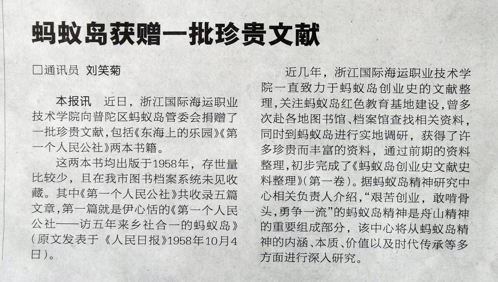 《舟山晚报》:蚂蚁岛获赠一批珍贵文献